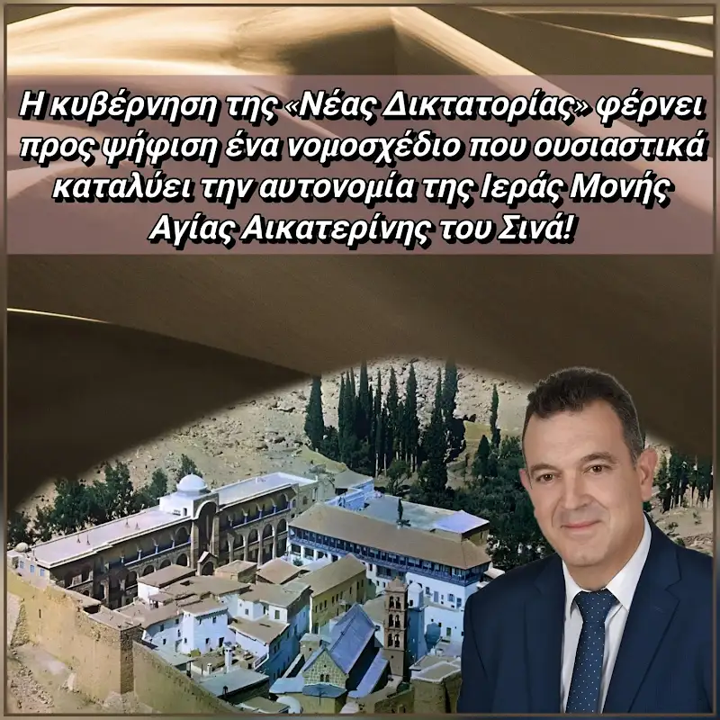 Η κυβέρνηση της «Νέας Δικτατορίας» φέρνει προς ψήφιση ένα νομοσχέδιο που ουσιαστικά καταλύει την αυτονομία της Ιεράς Μονής Αγίας Αικατερίνης Σινά, μέσω της σύστασης νομικού προσώπου δημοσίου δικαίου, το οποίο θα εποπτεύεται από κρατικό φορέα. Πρόκειται για μια κατάφωρη παραβίαση του ιστορικά κατοχυρωμένου αυτοδιοικήτου της Μονής και μια ύπουλη απόπειρα κρατικού ελέγχου επί της περιουσίας της.