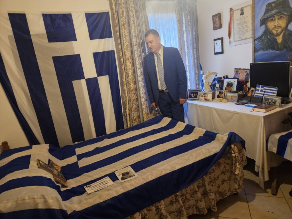 Στο πιο ψηλό σημείο του χωριού του, σήκωσε έναν σταυρό διακοσίων κιλών και τον στήλωσε εκεί ψηλά, για να φαίνεται από παντού — δίπλα στον σταυρό κυματίζει περήφανα, όπως και η ψυχή του, η ελληνική σημαία.