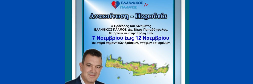 Ο Πρόεδρος του Κινήματος ΕΛΛΗΝΙΚΟΣ ΠΑΛΜΟΣ, Δρ. Νίκος Παπαδόπουλος, θα βρίσκεται στην Κρήτη από 7 Νοεμβρίου έως 12 Νοεμβρίου, σε σειρά σημαντικών δράσεων, επαφών και ομιλιών.