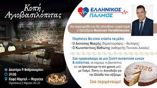 ΜΑΡΟΥΣΗ ΔΕΥΤΕΡΑ 9-2-26 Δευτέρα 9/2 ώρα 19:00NoBell Restaurant-Café (μπροστά στη στάση του ΗΣΑΠ) Ομιλητές: Νίκος ΠαπαδόπουλοςΚωνσταντίνος Βαθιώτης Διονύσιος Μακρής Πλοήγηση άρθρων ΙΩΑΝΝΙΝΑ. Συνάντηση ομάδας του Ελληνικού Παλμού Ηπείρου ΜΑΡΟΥΣΙ. ΑΠΕΥΘΕΙΑ ΑΝΑΜΕΤΑΔΟΣΗ ΑΠΟ ΤΗΝ ΕΚΔΗΛΩΣΗ ΚΟΠΗΣ ΑΓΙΟΒΑΣΙΛΟΠΙΤΑΣ