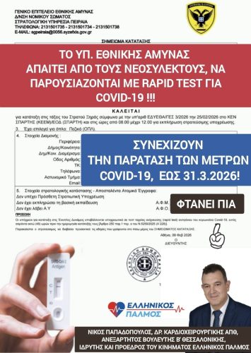 ΥΓ. Αντίστοιχη ερώτηση έχει υποβληθεί και στο Υπ. Εθνικής Άμυνας γιατί απαιτεί από τους νεοσύλεκτους να παρουσιάζονται με rapid test για Covid-19 !!!