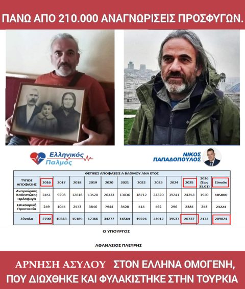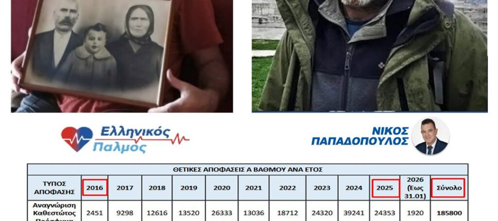 Σύμφωνα με τον σχετικό πίνακα, οι αποφάσεις αναγνώρισης ιδιότητας πρόσφυγα ή επικουρικής προστασίας σε α’ βαθμό το 2016 ήταν 2.700. Δέκα χρόνια αργότερα, το 2025 ήταν 26.737. Δηλαδή δεκαπλάσιες αναγνωρίσεις! Συνολικά σε α’ και β’ βαθμό, στα δέκα αυτά χρόνια, αναγνωρίστηκαν πάνω από 210.000 πολιτικοί «πρόσφυγες», αλλά δεν αναγνωρίζεται ο ‘Έλληνας ομογενής που αποδεδειγμένα φυλακίστηκε και διώχθηκε από το Τουρκικό καθεστώς.